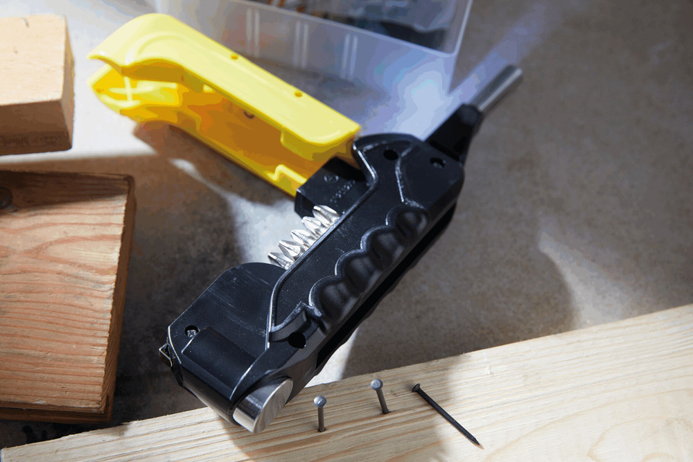 Multifunktionswerkzeug HINGED: mit Wasserwaage, ausklappbarem Schraubendreher mit 12 verschiedenen Bits, LED-Licht, Hammer und Maßband 1 m, batteriebetrieben (2x CR2032 Knopfzellen enthalten), in Box