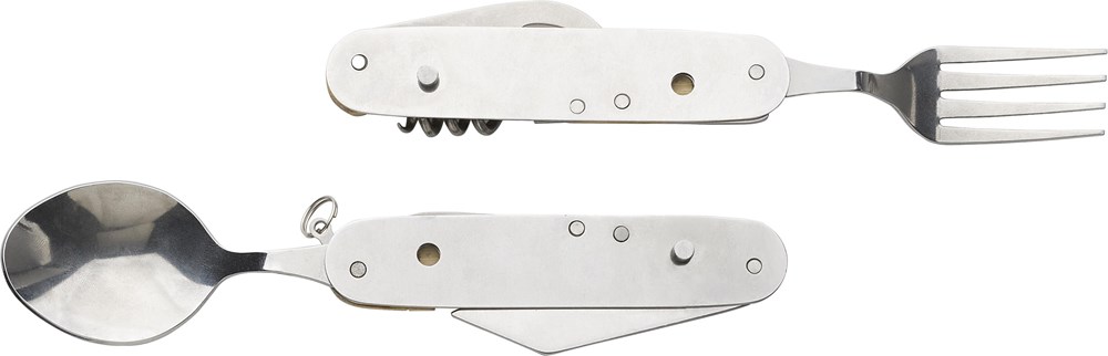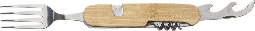 Multifunktionales Besteck aus Bambus (Löffel, Gabel, Messer, Flaschenöffner, kleineres Messer). Das Besteck kann für beide Hände getrennt werden. Einzeln verpackt in einer braunen Kartonbox.