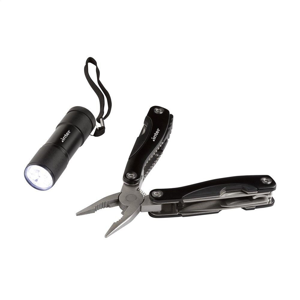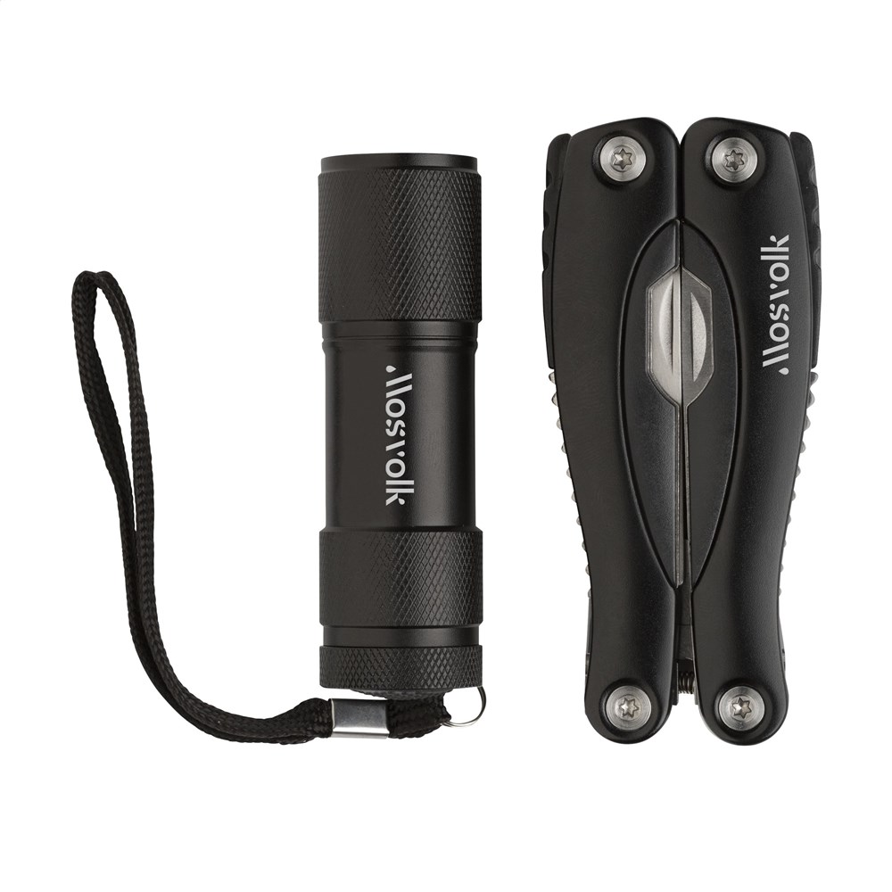 Geschenkset: • 9-teiliges Edelstahl Multitool mit 13 Funktionen und Aluminiumgriff in Metalloptik. Aluminium Taschenlampe (Ø 2,7 x 9 cm) mit 9 rein-weißen energieeffizienten LEDs und abnehmbarer Schlaufe. Inklusive Batterien. Jedes Set in einer Box. Pro Set in einer Verpackung.