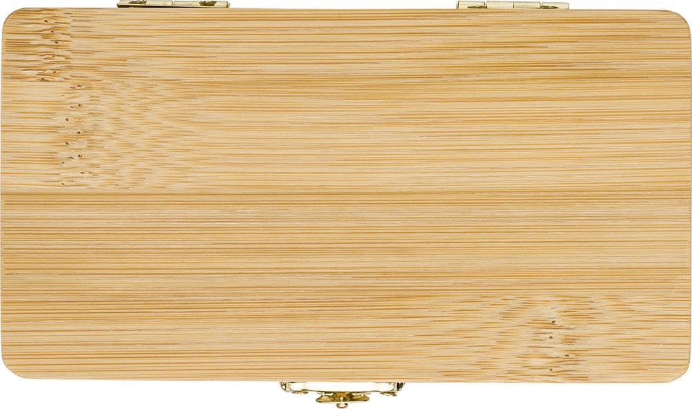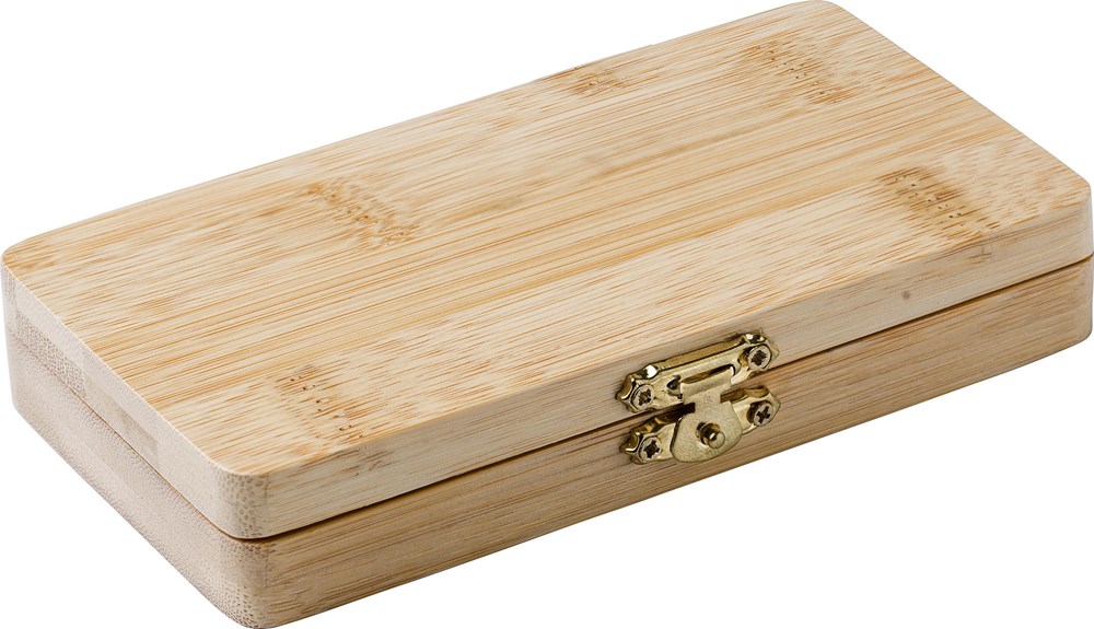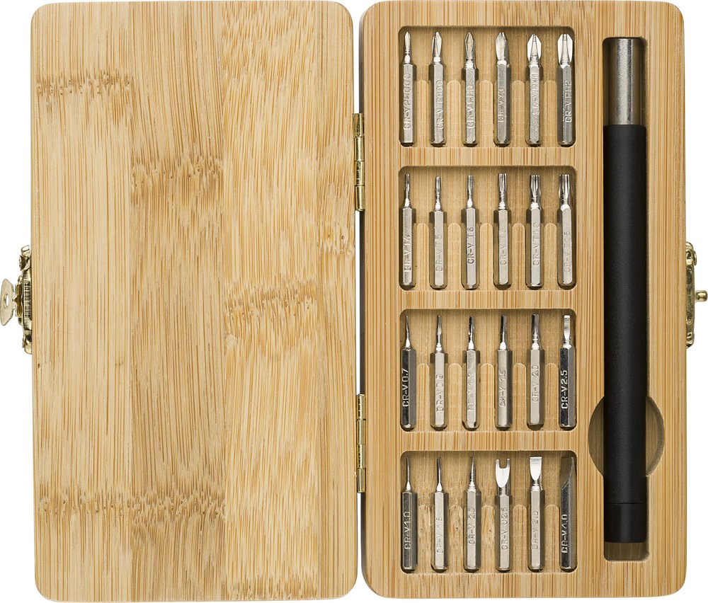 Bambus-Werkzeugsatz mit 25 Teilen. 24 Bits und ein Halter. Einzeln verpackt in einer braunen Kartonbox.