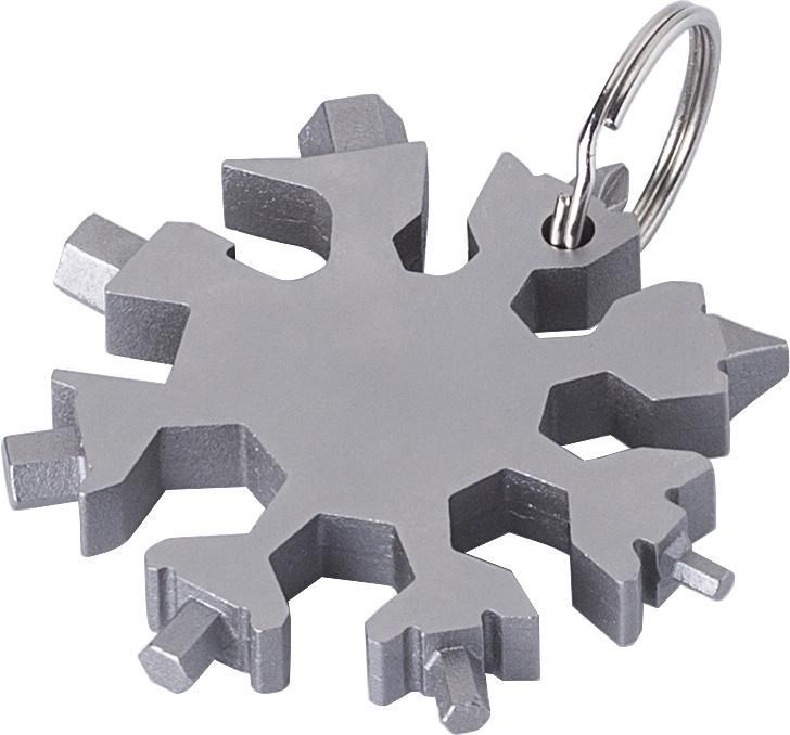 Multitool aus rostfreiem Stahl mit 17 Funktionen (Schlitzschraubendreher, Flaschenöffner, Schraubschlüssel, Schnurmesser und Inbusschlüssel in verschiedenen Größen). Inklusive Schlüsselring. Geformt wie eine Schneeflocke. Einzeln verpackt in einer braunen Kartonbox. Nur für Promotionzwecke