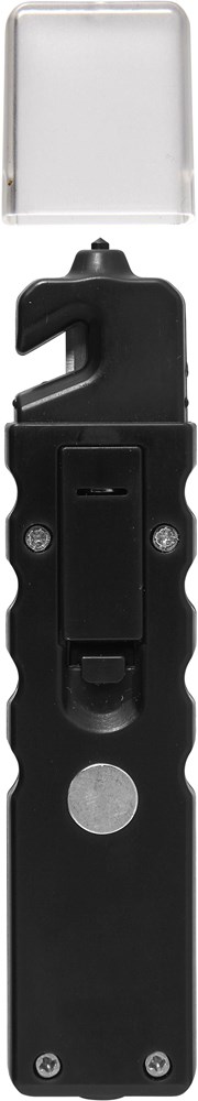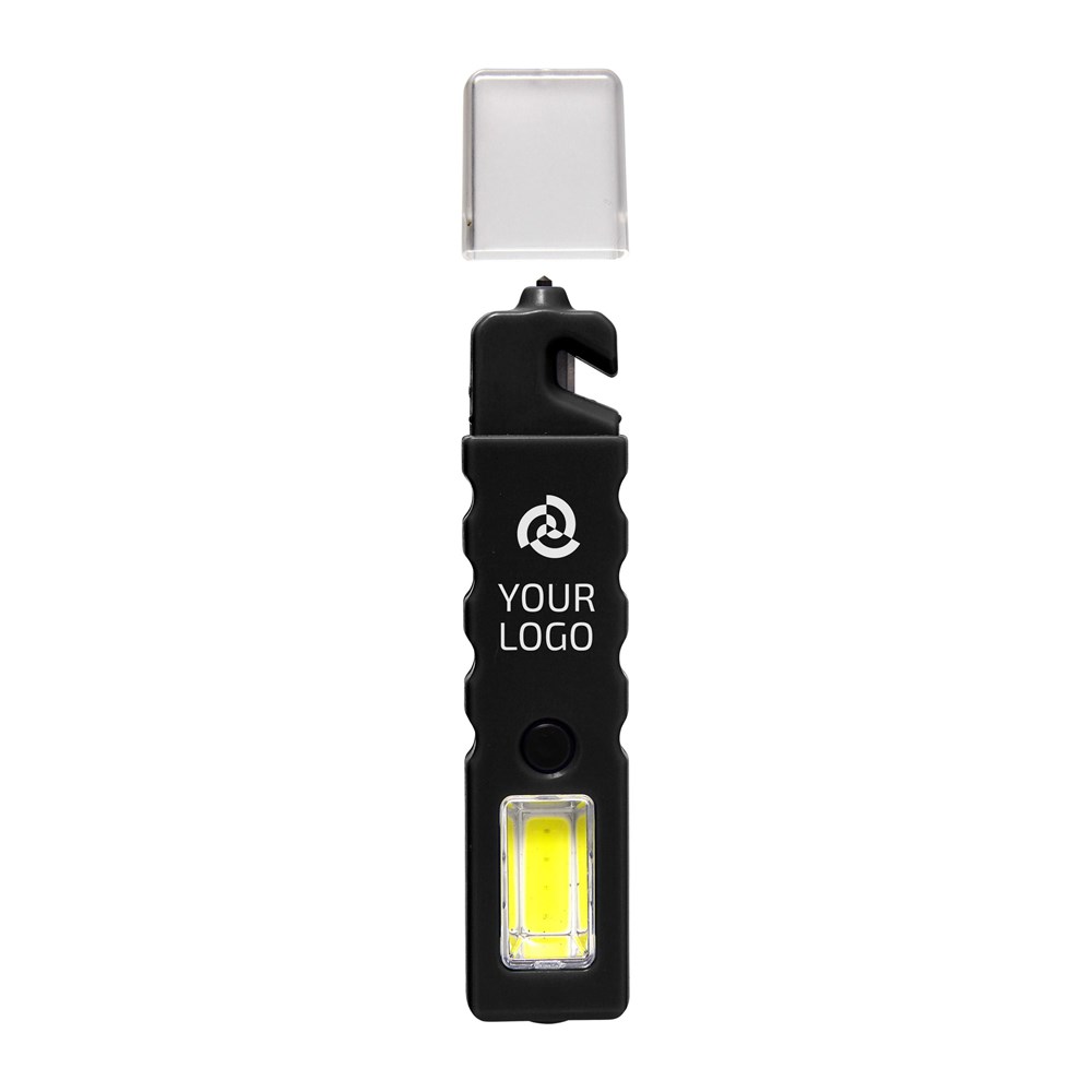 Multifunktions-Sicherheitswerkzeug für das Auto mit COB-Licht (vier LEDs) inkl. Blinkoption, Glashammer und Sitzgurtschneider (mit Schutzkappe). Das Werkzeug ist zudem mit einem Magnet ausgestattet.