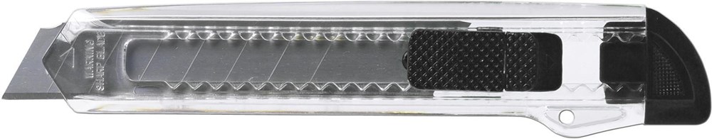 Cuttermesser aus Kunststoff, transparent mit farbigen Akzenten und 8 Klingen, arretierbar.