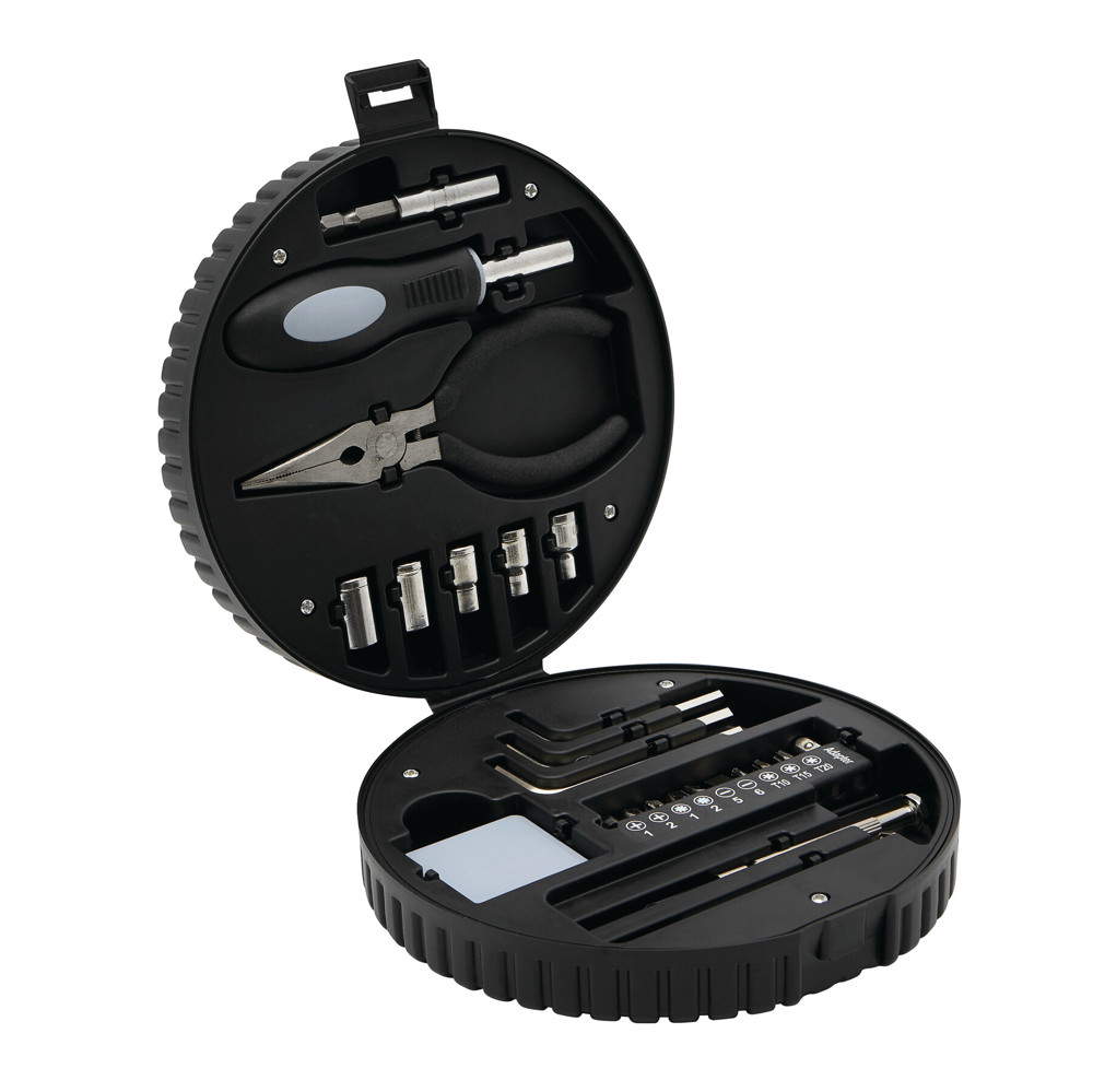 Werkzeug-Set COMPACTY, 24-teilig: bestehend aus Aufbewahrungsbox im Autoreifen-Design, 1 Schraubenzieher, 1 Zange, 10-teiliges Bit-Set, 5 Fassungen, 3 Sechskantschlüssel, 2 Präzisionsschraubenzieher, 1 Maßband, in Box