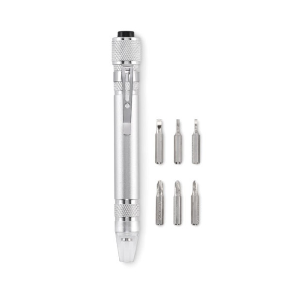 Multitool in Form eines Stiftes aus recyceltem Aluminium. Inkl. 3 Schlitz- und 3 Phillips-Schraubendreherköpfen und Taschenlampe. Inkl. 4 Knopfzellen LR41.