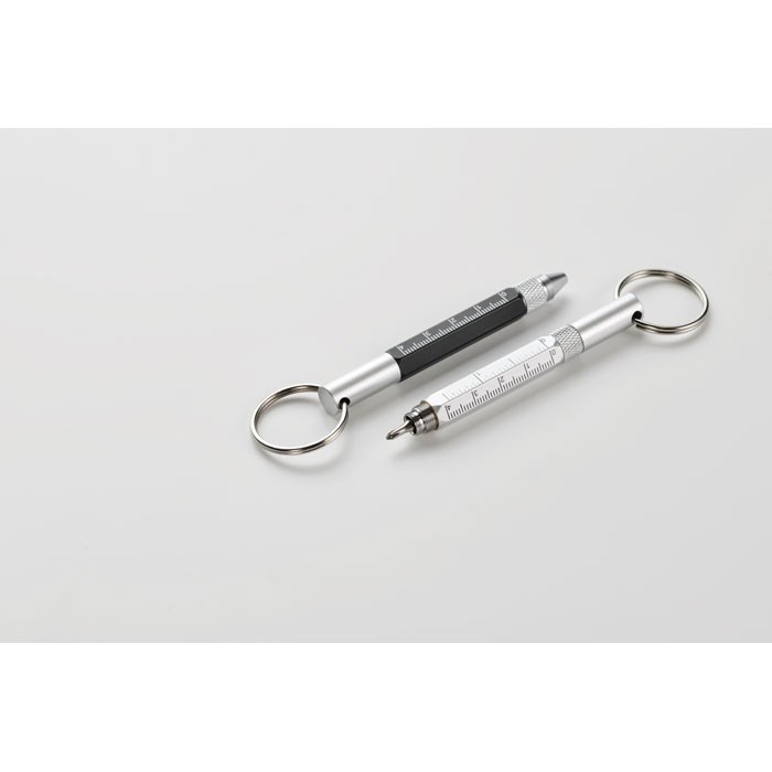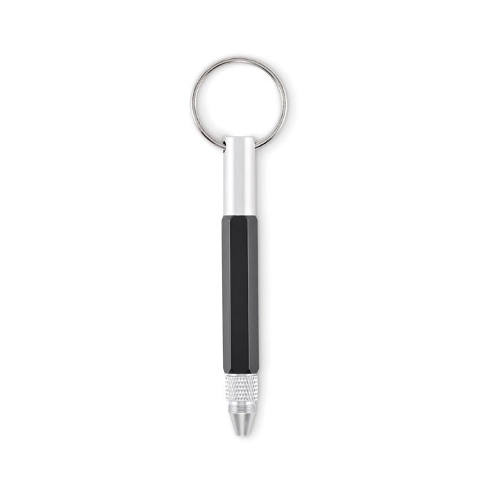 Schlüsselring mit Drehkugelschreiber aus recyceltem Aluminium, Stylus, Lineal 4 cm/1,5 Zoll und 2in1 Phillips- und Flachkopfschraubendreher. Schwarze Tinte.