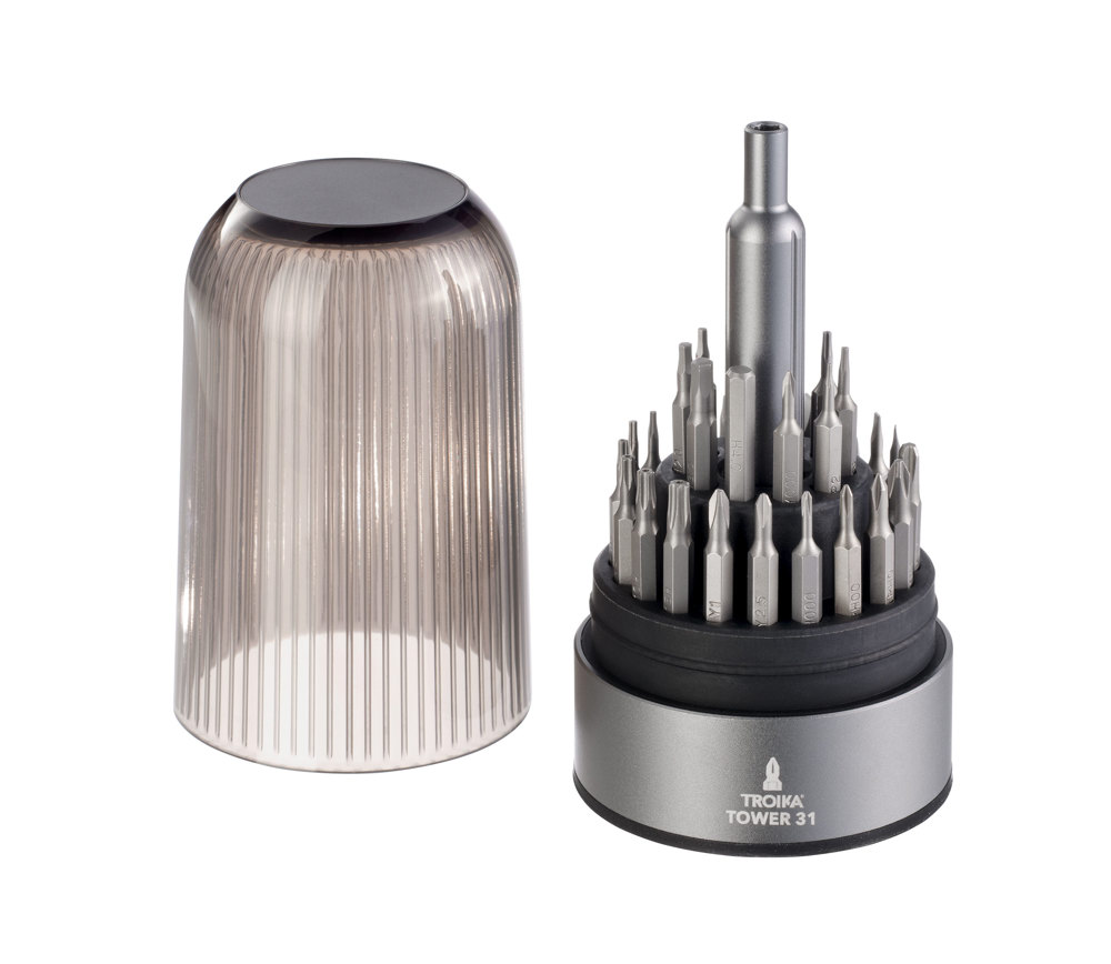 Bit Pen Werkzeug-Set mit 30 Präzisions-Bits und magnetischem Bithalter, einfaches Verstauen aller Bits im Sockel, geeignet für Reparaturen im Haushalt, z. B. Küchenwaage, LED-Lichterkette, Fernbedienungen etc., rutschhemmender Silikonboden für Standfestigkeit und besseren Grip, Aluminium, Chrom-Vanadium-Stahl, Silikon, matt, grau