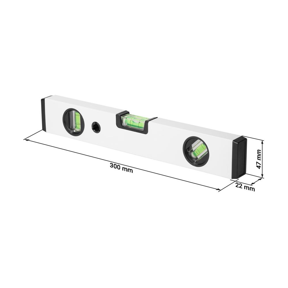 Leichte Wasserwaage aus Aluminium mit einer Länge von 30 cm. Versehen mit Kunststoff-Endkappen, die das Profil bei Schlägen schützen. Mit einer horizontalen, vertikalen und 45 Grad Libelle für sämtliche Messanforderungen und einem kleinen Loch zum einfachen Aufhängen. Einfach zu Reinigen dank der glatten Seitenflächen.