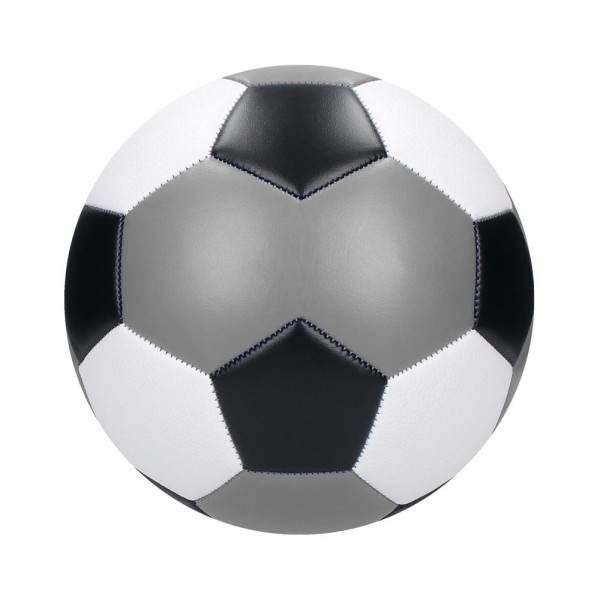 Ein Fußball der auffällt! Maschinell genähter Fußball aus PVC in den Farben weiß, schwarz und grau. Größe 5. Der Ball ist 3-lagig und hat 32 Panele inkl. einem Doppelpanel. Er verfügt über eine Dicke von 2,0 mm, ein Butyl-Ventil und eine Latex-Blase. Gewicht: 330-360 g.