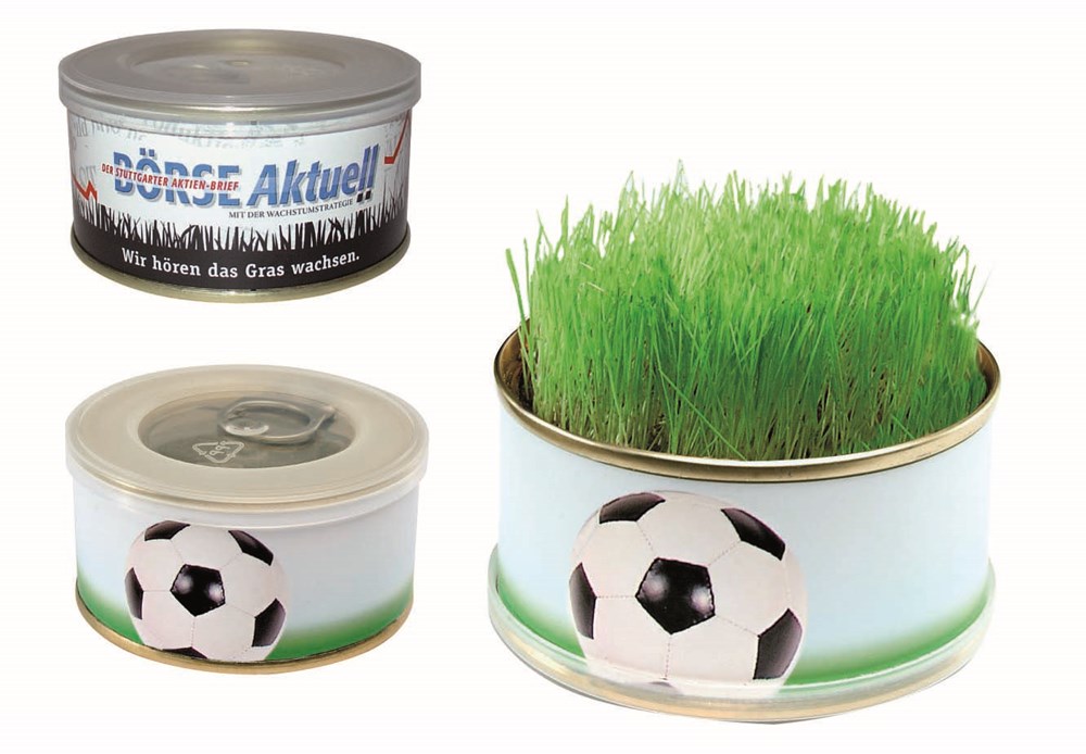 Mit dieser kleinen Weißblechdose haben Sie Ihre Arena auf dem Schreibtisch. Die Grassamen sind bereits im Substrat eingelegt. Öffnen, gießen und das grüne Gras sprießt schon nach ca. 10 Tagen. Rund um die Dose bietet die Banderole Platz für Ihre Werbebotschaft auf dem Standardmotiv oder eine eigene Gestaltung der Banderole, jeweils ab 250 Stück. Inhalt: Wachstumsgranulat, Samen: Zimmerrasen