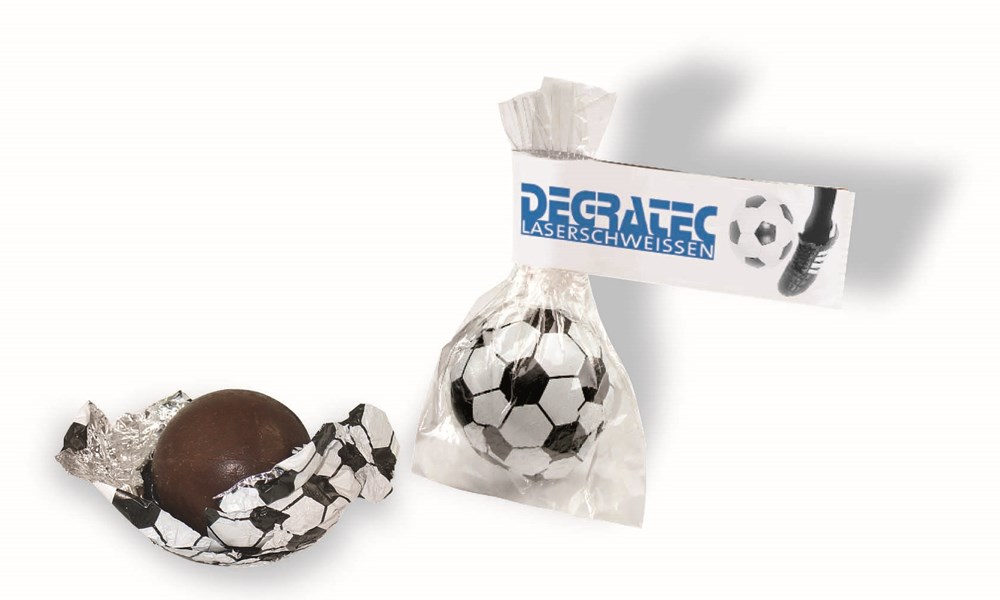 Lassen Sie sich die feine Edelvollmilch-Schokolade auf der Zunge zergehen. Dieser Ball-Geschmack versüßt jedes Fußballspiel. Nutzen Sie das Papierfähnchen als Ihren Werbeträger. Ihr Werbedruck auf dem Standardmotiv des Fähnchens oder eine eigene Gestaltung, jeweils ab 250 Stück. Inhalt: Schokoladenfußball Ø ca. 30 mm (5,6 g feinste Edelvollmilch-Schokolade)
