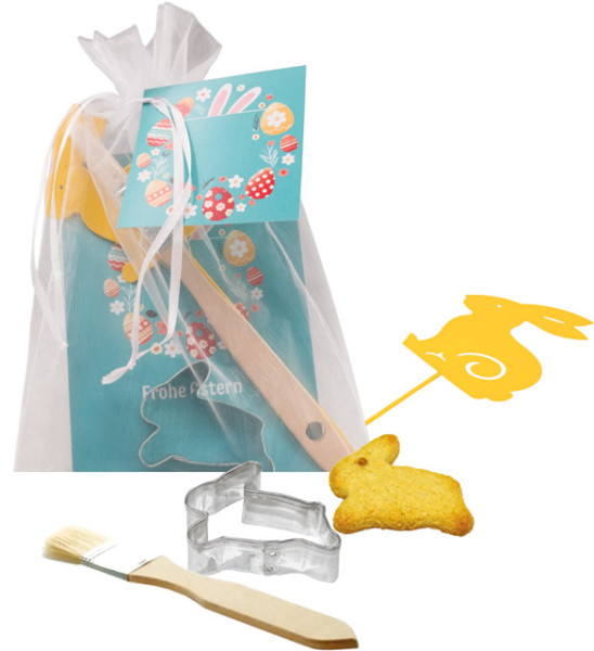 Inhalt: Grußkarte, Backpinsel, Metall-Stecker Hase gelb (ca. 205 x 60 mm), Ausstechform Hase ca. 5 cm (ohne Gebäck)