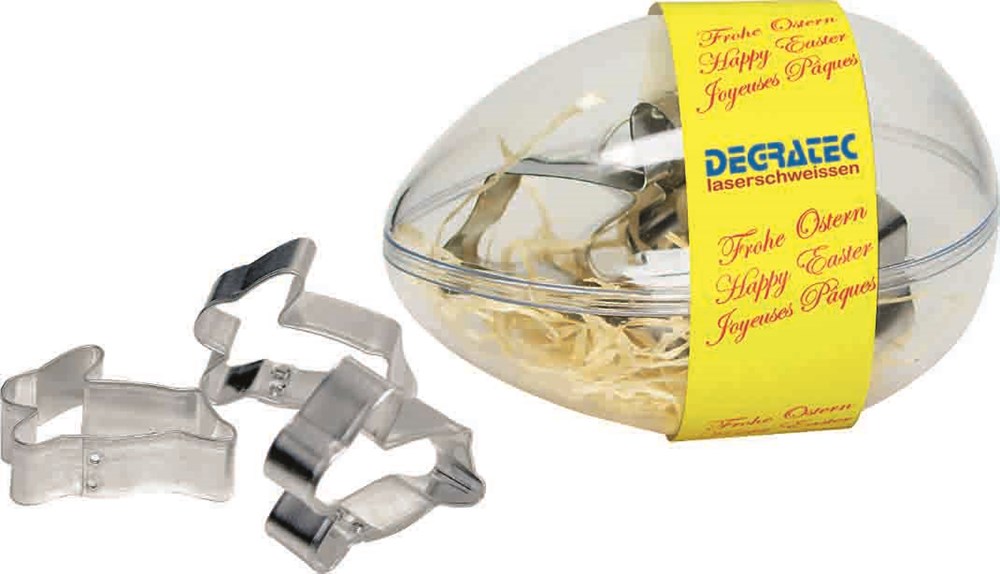 Osterzeit ist Back-Zeit. Drei Weißblech-Ausstechform in Hasen-Form, eingelegt in transparentem Ei. Ein Backrezept befindet sich auf der Banderole aufgedruckt. Hier ist auch Platz für den Werbeaufdruck. Auch eine eigene Gestaltungnder Banderole kann ab 250 Stück erfolgen. Inhalt: 3 Ausstechformen Hase je ca. 5 cm (ohne Gebäck)
