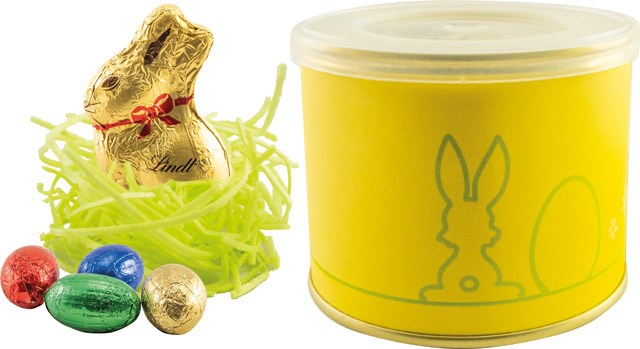 Die Schokoladeneier und der Lindt Goldhase sind in essbarem Ostergras eingebettet. Ein komplett süßes Osternest für Ihre Kunden. Die Dose mit dem PE-Deckel kann anschließend als Aufbewahrungsbehältnis genutzt werden. Die Banderole bietet viel Platz für Ihre Werbebotschaft oder, ebenfalls ab 250 Stück, für Ihre individuelle Gestaltung.
