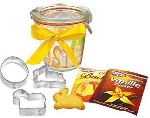 Inhalt: Weckglas (290 ml), 3 Ausstechformen je ca. 5 cm (Hase, Ei, Lamm), Vanillezucker, Backpulver, Rezept auf dem Einleger (ohne Gebäck)