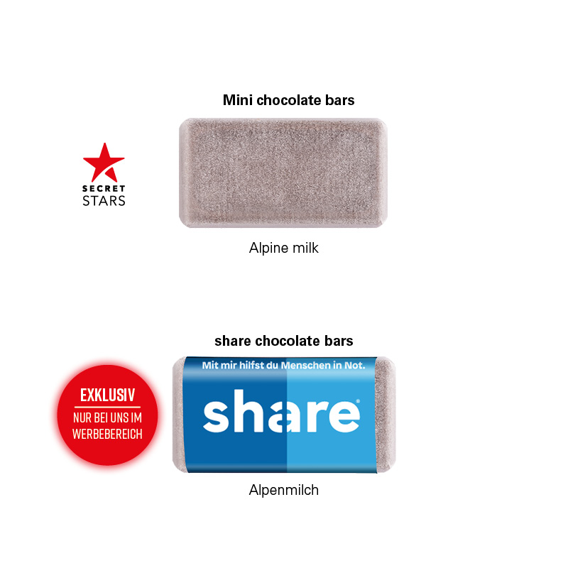 Adventskalenderturm in Vollkartonhülle mit Papierblister, rundum individuell bedruckt. mit 5 Werbeflächen. Inhalt: 24 Alpenmilch-Schokotäfelchen, eingewickelt in Pergaminpapier, 72 g
