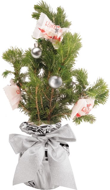 Inhalt: geschmückt mit 3 Raffaello-Pralinen (je 10 g), 4 silbernen Weihnachtskügelchen, Topffolie silber, Schleife silber