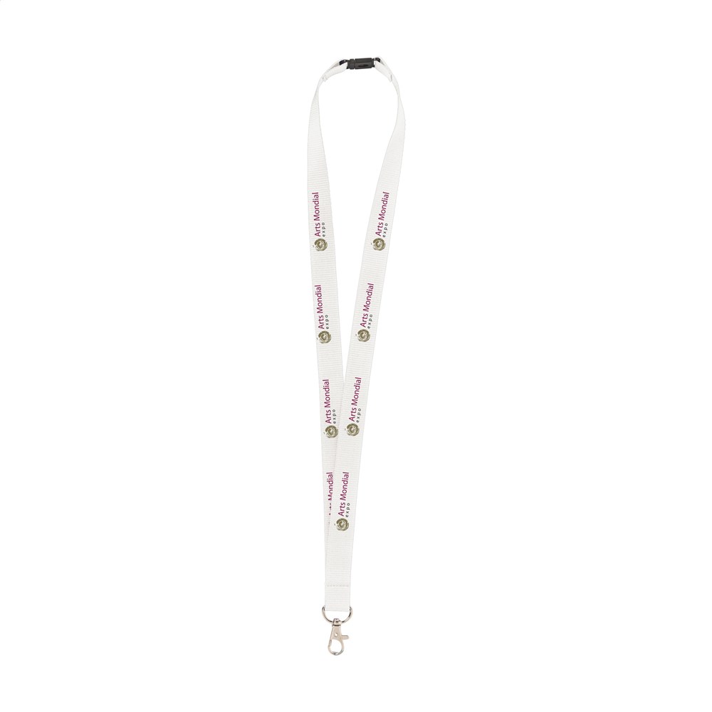 Umhängeband aus Polyester mit Karabinerhaken aus Metall und Sicherheitsverschluss.