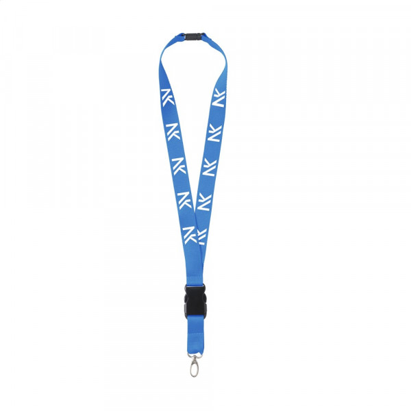 Schlüsselband aus stark gewebtem Polyester mit metallenem Karabinerhaken und Sicherheitsverschluss. Der untere Teil lässt sich durch ein Klicksystem aus Kunststoff abtrennen.
