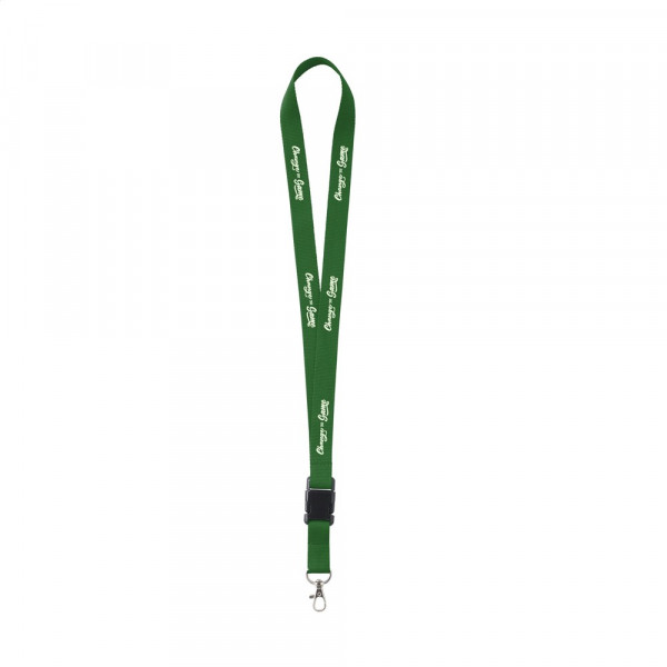 Schlüsselband aus stark gewebtem Polyester mit Karabinerhaken aus Metall. Der untere Teil lässt sich durch ein Klicksystem aus Kunststoff abtrennen.