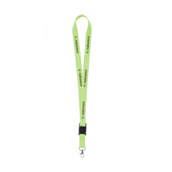Schlüsselband aus stark gewebtem Polyester mit Karabinerhaken aus Metall. Der untere Teil lässt sich durch ein Klicksystem aus Kunststoff abtrennen.