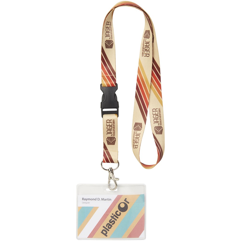 Bucks vollfarbig bedrucktes Sublimation Lanyard. Der Druck ist ein- oder beidseitig möglich. Beim beidseitigen Druck können Sie zwischen der Standard- und der Fitted-Option wählen (Fitted bedeutet, dass der Druck auf beiden Seiten ausgerichtet ist). Das Lanyard hat einen Metallhaken und eine Kunststoff-Schnalle. Kann ein Namensschild, einen Ausweis oder Schlüssel halten. Erhältlich in 4 verschiedenen Bandbreiten: 10, 15, 20 und 25 mm.