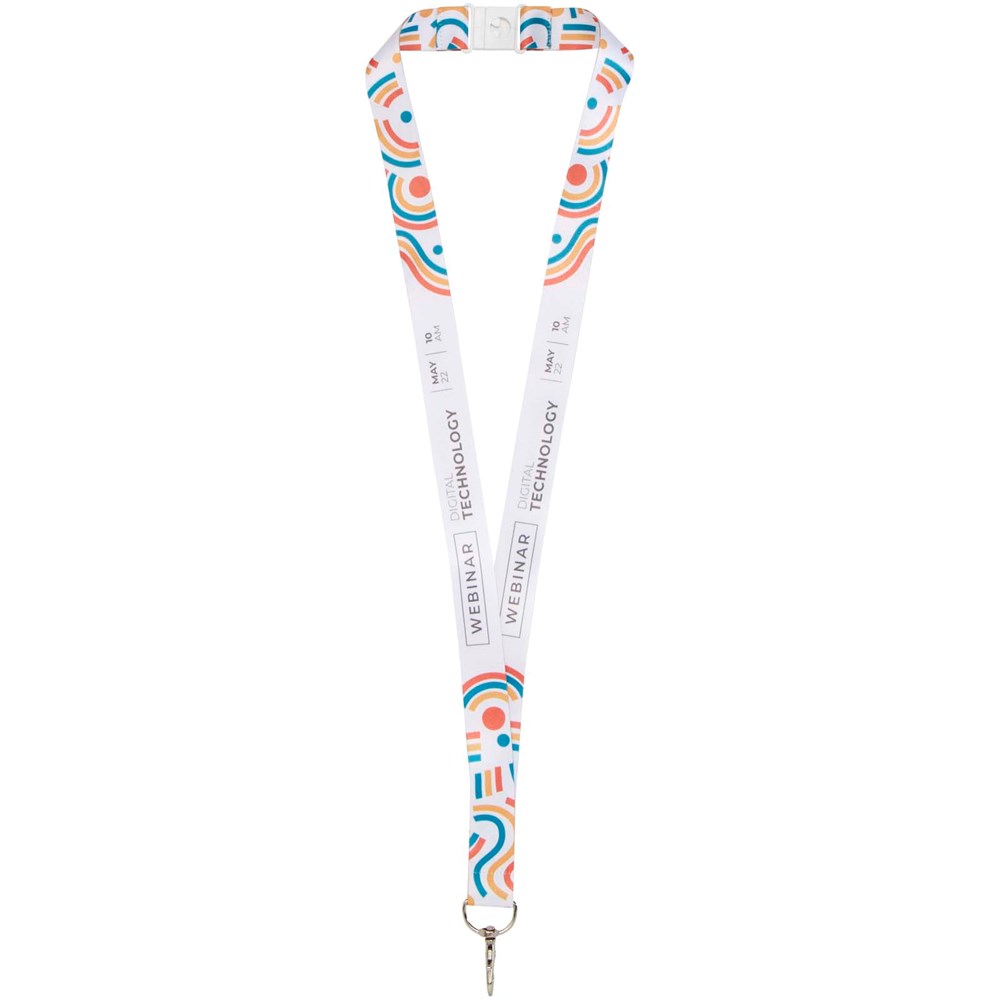 Addie vollfarbig bedrucktes Sublimation Lanyard. Der Druck ist ein- oder beidseitig möglich. Beim beidseitigen Druck können Sie zwischen der Standard- und der Fitted-Option wählen (Fitted bedeutet, dass der Druck auf beiden Seiten ausgerichtet ist). Das Lanyard hat einen Metallhaken und einen Abreißverschluss für z. B. Namensschilder, Ausweise oder Schlüssel. Verfügbar in vier Bandbreiten: 10, 15, 20 und 25 mm.