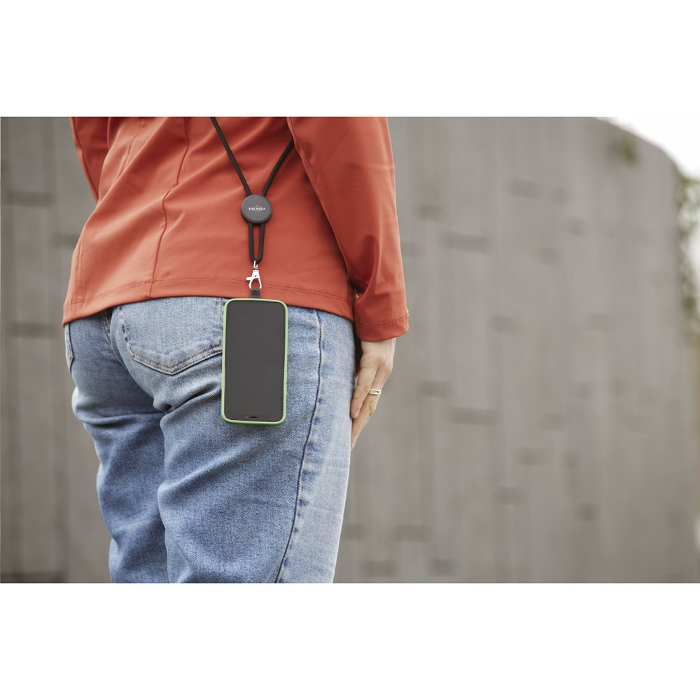 Verstellbares Handy-Lanyard mit Rundschnur aus 100% GRS RPET Polyester. Mit Metallkarabiner, verstellbarer Schlaufe und Stoppern aus Aluminium und einem runden Tag aus recyceltem Kunststoff. Der universelle Patch ermöglicht es, Ihr Smartphone an Ihrem Schlüsselband zu befestigen. Mit dieser Kombination tragen Sie Ihr Smartphone sicher um Ihren Hals. So haben Sie Ihr Mobiltelefon schnell zur Hand und halten Ihre Taschen und Hände frei. Das Patch ist mit den meisten Kombinationen aus Smartphone und Hülle kompatibel, außer mit Hüllen mit offener Unterseite. Das System ist so konzipiert, dass es den Ladeanschluss des Telefons nicht blockiert. GRS-zertifiziert. Gesamtes recyceltes Material: 40%.