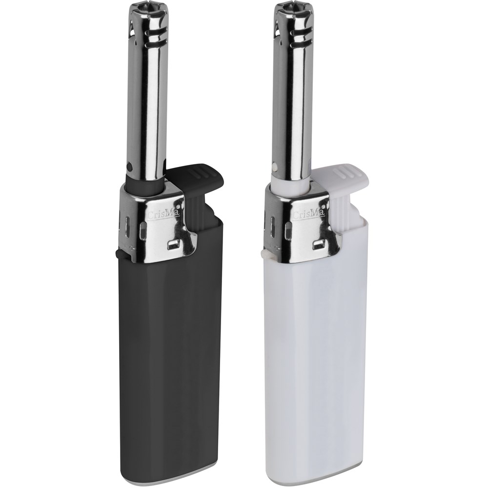 Elektronik Feuerzeug mit verlängertem Aufsatz für schwer erreichbare Dochte, nachfüllbar. Die Flammengröße lässt sich stufenlos verstellen. Ihr Werbeaufdruck erfolgt auf einer Seite.