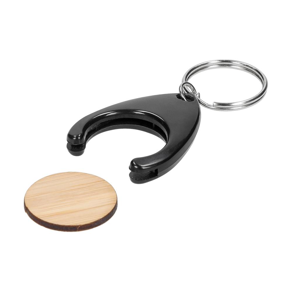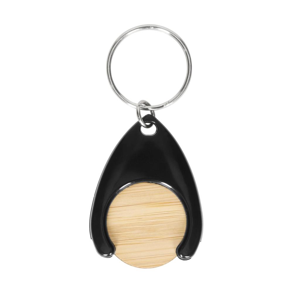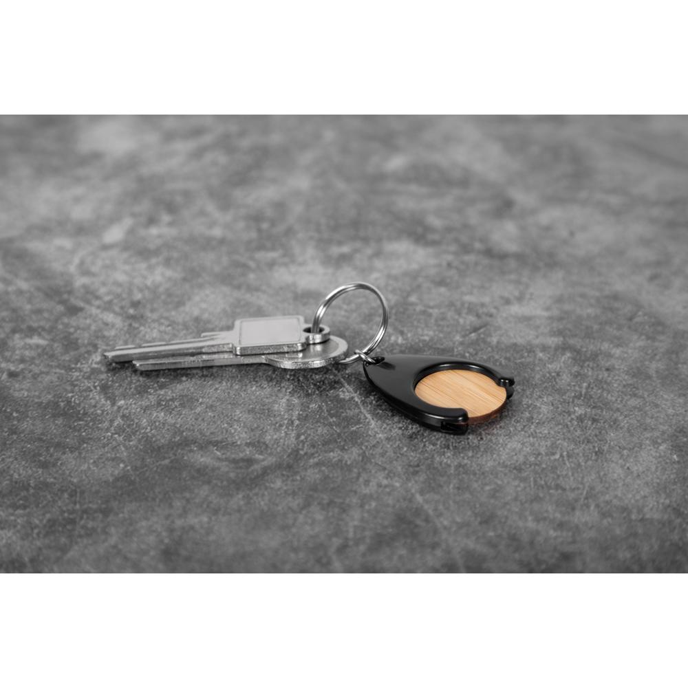 Formschöner Schlüsselanhänger aus Kunststoff mit integriertem Einkaufswagenchip (Ø 24 mm) aus Bambus. Inklusive Schlüsselring.