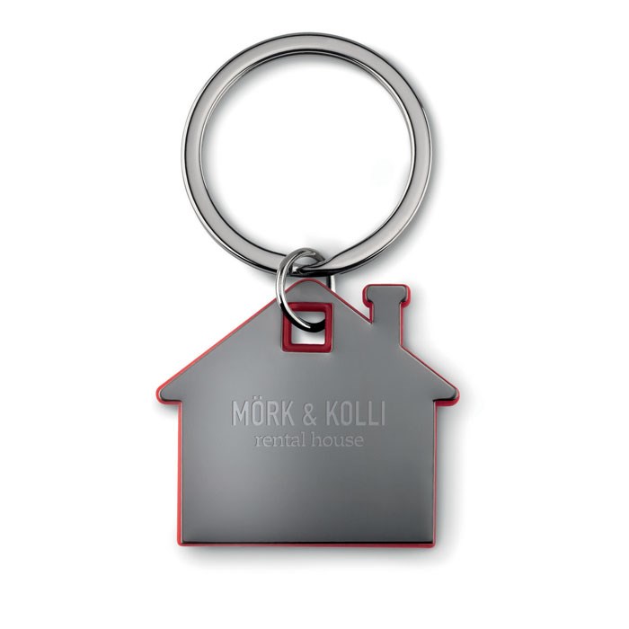Schlüsselring mit Anhänger in Optik eines Hauses aus Edelstahl und Kunststoff.