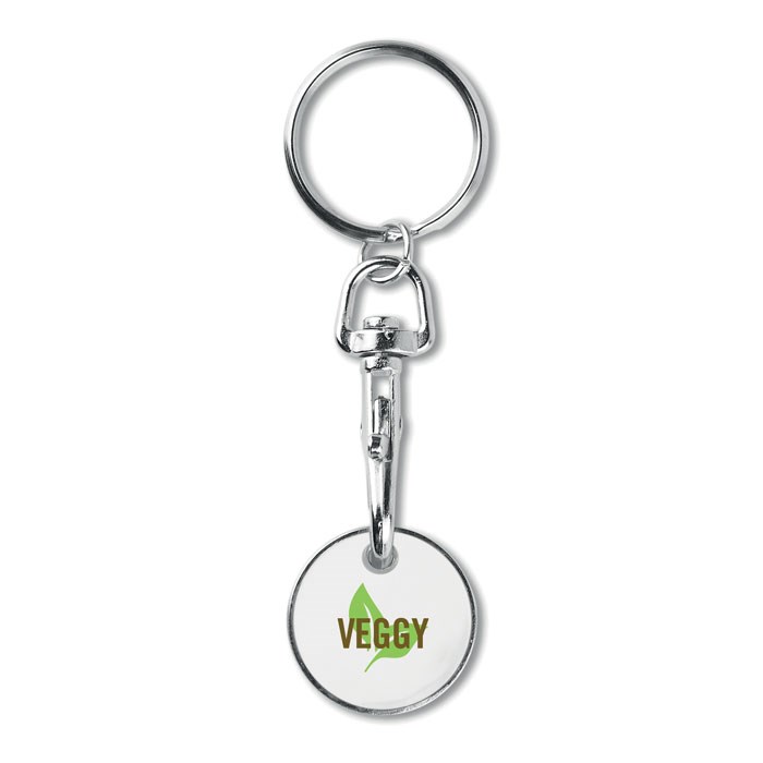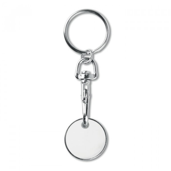 Schlüsselring mit Einkaufswagenchip 1 EUR. Eisen mit Emaillebeschichtung auf der Frontseite. Chip Ø23,2 x 2,1mm Stärke.