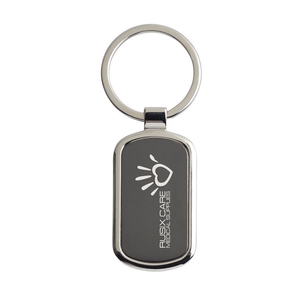 Rechteckiger, hochglänzender Schlüsselanhänger aus Nickel mit schwarzem Metall-Inlay und festem... mehr