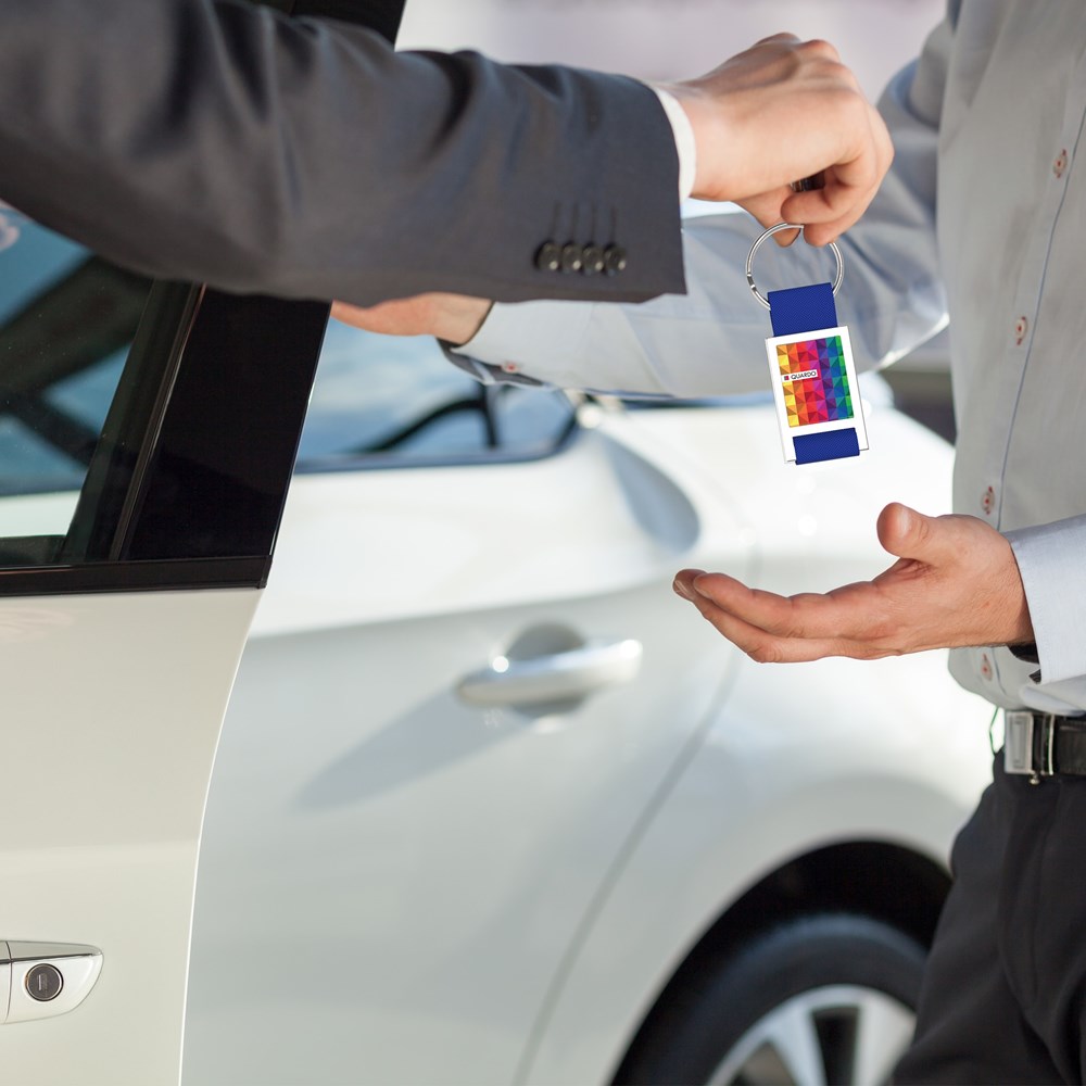 Der Schlüsselanhänger Quadro ist eine Kombination aus Metall und Textil in einem Schlüsselanhänger. Dieser Schlüsselanhänger kann mit einem vollfarbigen Doming personalisiert werden.