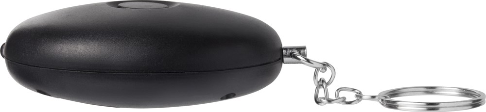 Alarmknopf aus ABS Kunststoff mit Schlüsselkette und -ring. Das LED Licht wird durch Drücken des Knopfs ausgelöst. Durch das Ziehen am Stift wird der Signalton ausgelöst.