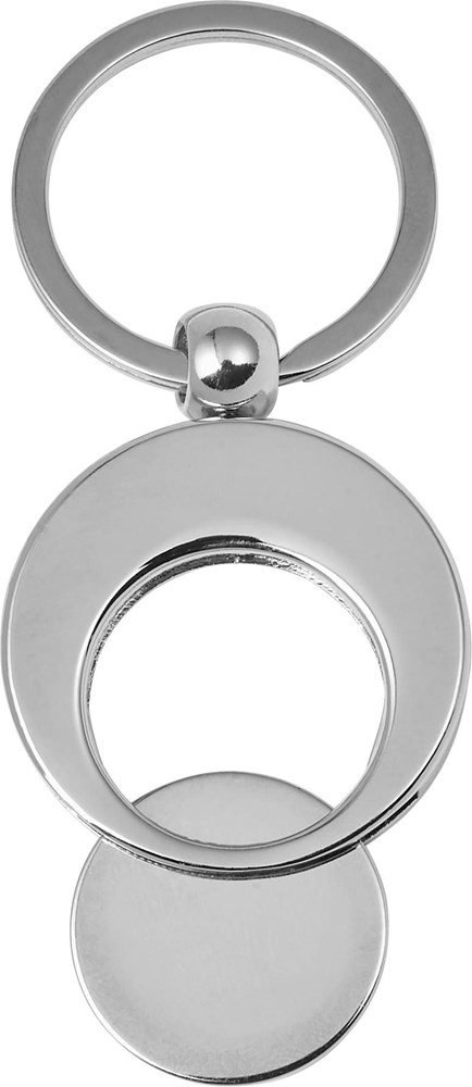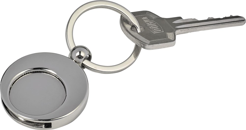 Schlüsselanhänger aus Metall mit Einkaufswagenchip und extra großem Schlüsselring. Durchmesser des kleinen Kreises 2,3 cm und des großen Kreises 3,4 cm