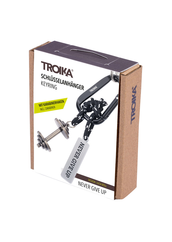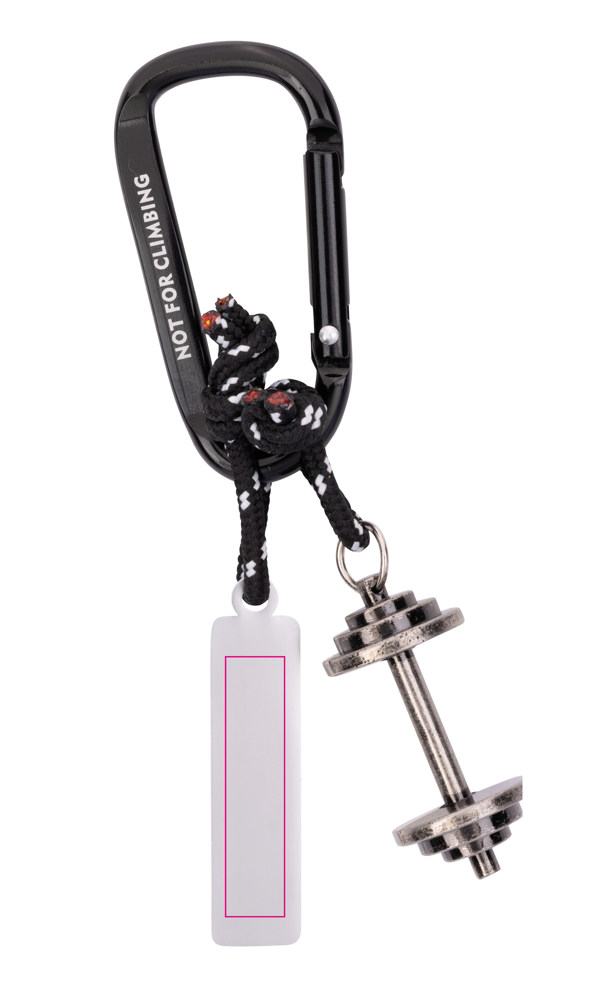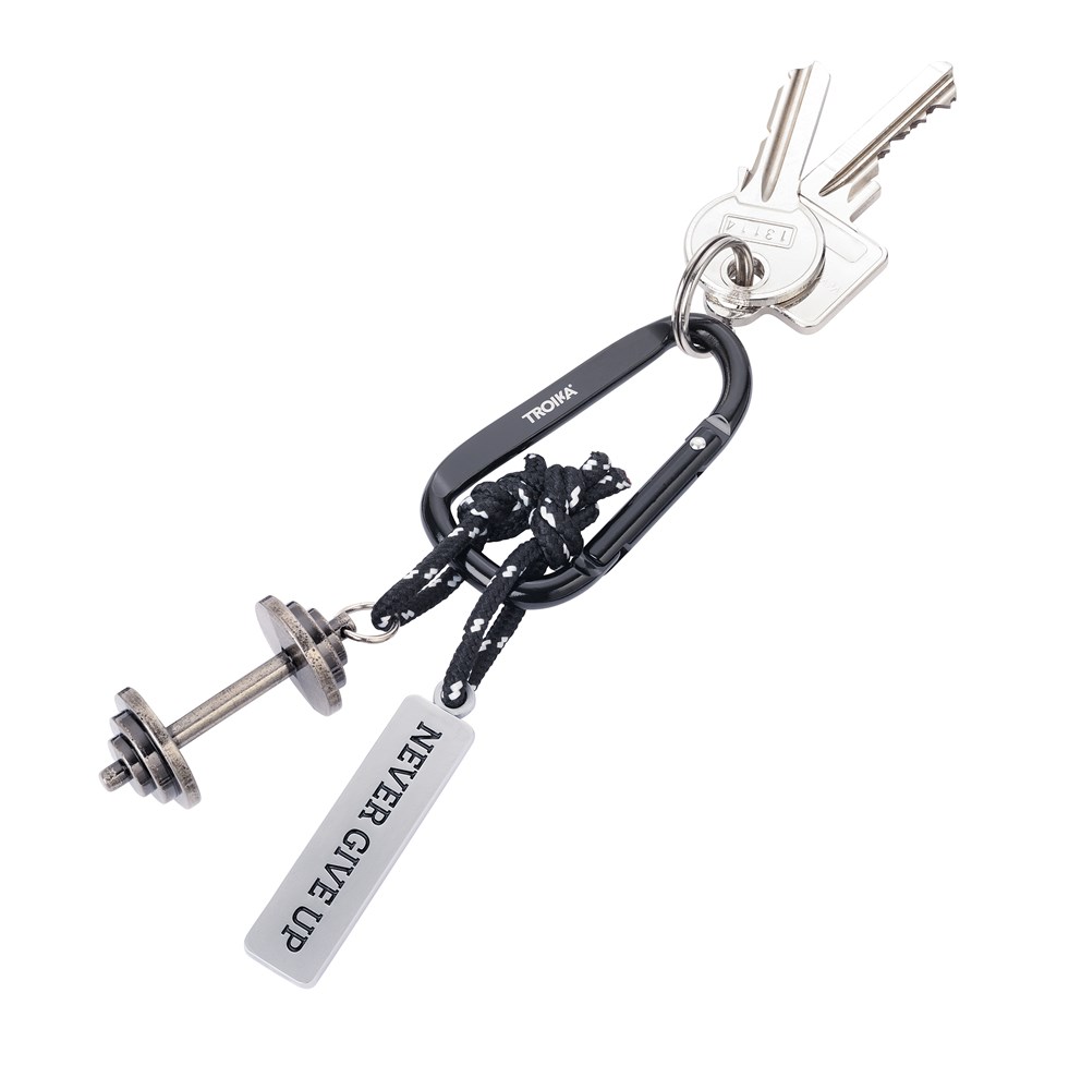 Schlüsselanhänger mit Karabinerhaken, 2 Anhänger an dekorativem Kletterseil: Hantel und Plakette "NEVER GIVE UP", Metallguss, verchromt, matt, schwarz/silberfarben