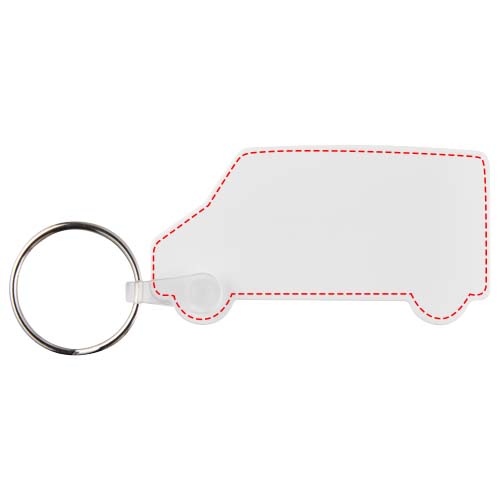 Weißer Schlüsselanhänger in Form eines Vans mit metallenem Schlüsselring. Der Metallring bietet ein flaches Profil, das sich ideal für Mailings eignet.