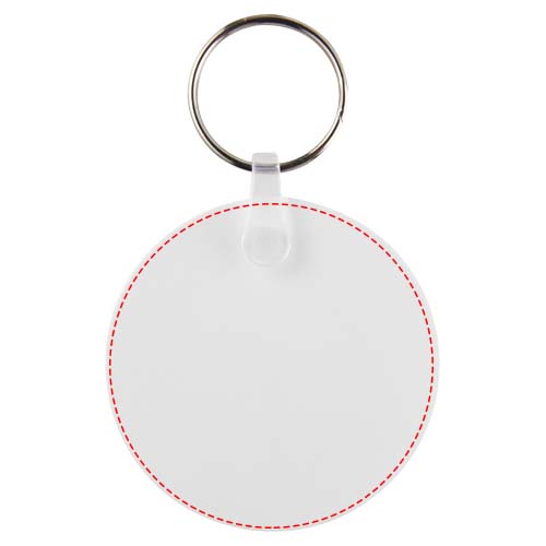 Weißer kreisförmiger Schlüsselanhänger mit metallenem Schlüsselring. Der Metallring bietet ein flaches Profil, das sich ideal für Mailings eignet.