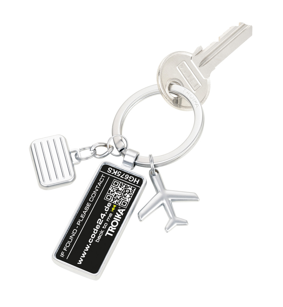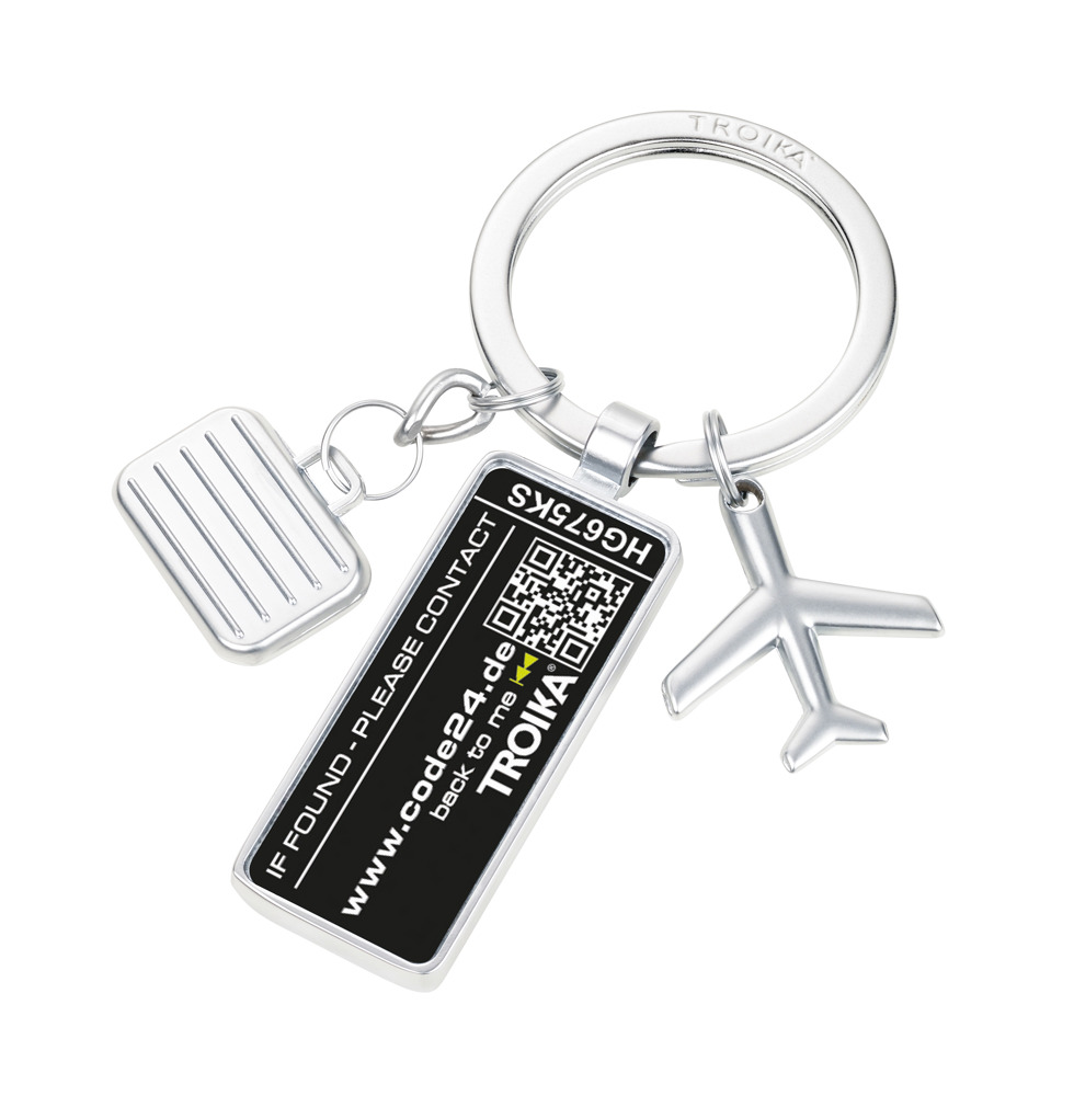 Schlüsselanhänger mit Lost and Found Service, 3 Charms: Flugzeug, Koffer und Plakette, Inklusive 2 Jahre kostenlosem Fundservice nach Registrierung, Metallguss, verchromt, matt, silberfarben