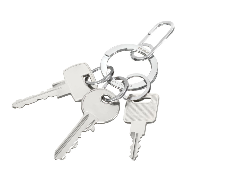 Schlüsselanhänger mit Karabinerhaken, inkl. 3 kleiner Ringe, schnelles & einfaches Anbringen der Schlüssel dank patentiertem Öffnungsmechanismus (TROIKA NAIL GUARD), fingernagelschonend, Edelstahl, verchromt, glänzend, silberfarben