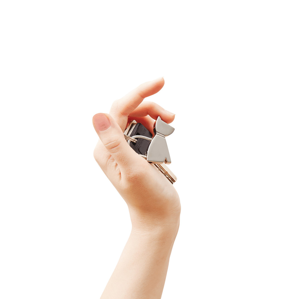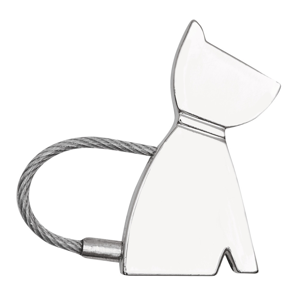 Schlüsselanhänger PERRO: im Design eines Hundes, Verschluss mit Stahlseil und sicherem Steckmechanismus, aus hochglanzverchromtem Metall