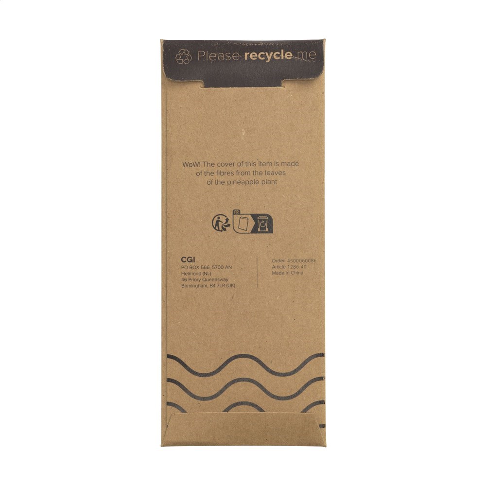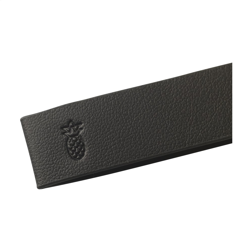 Schlüsselanhänger gefertigt aus aus Ananas-veganem-Kunstleder. Befestigt an einem stabilen Metallschlüsselring. Das vegane Kunstleder ist von echtem Leder kaum zu unterscheiden. Allerdings besteht das Material aus Ananasblättern, einem Restprodukt aus dem Ananasanbau. Aus diesem Grund werden für die Herstellung keine zusätzlichen Stoffe wie Wasser, Dünger oder Pestizide benötigt. Die Fasern der Ananasblätter werden gewaschen, mit PU angereichert und im Ofen getrocknet. Das Ergebnis? Geschmeidige Laken aus veganem Kunstleder, die anschließend mit einem schönen Finish versehen werden. Nach dem Trocknen entsteht ein weiches und attraktives Material mit den Eigenschaften von Leder. Es besteht teilweise aus Fruchtresten und teilweise aus PU.