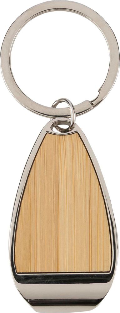 Schlüsselanhänger aus Zinklegierung verfügt über einen Metallring und eine Bambus-Einlage auf der Vorderseite. Er verfügt über eine Flaschenöffnerfunktion. Er wird in einer Papiertüte geliefert.
