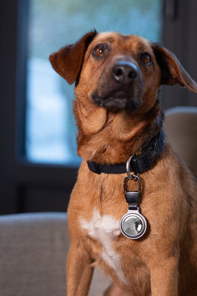 Schlüsselanhänger / Schutzhülle für APPLE AirTag®, mit Karabiner für flexible Befestigung an: Schlüsselbund, Rucksack, Laptoptasche, etc., Aussparung mit Magnetverschluss, Aluminium, matt, silberfarben