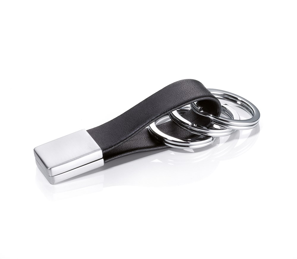 Schlüsselanhänger mit eckigem "Twist-Verschluss", Lederschlaufe, 3 Schlüsselringe, Leder/Metall, schwarz