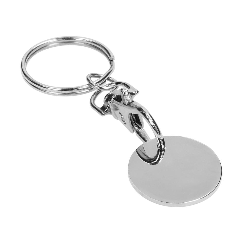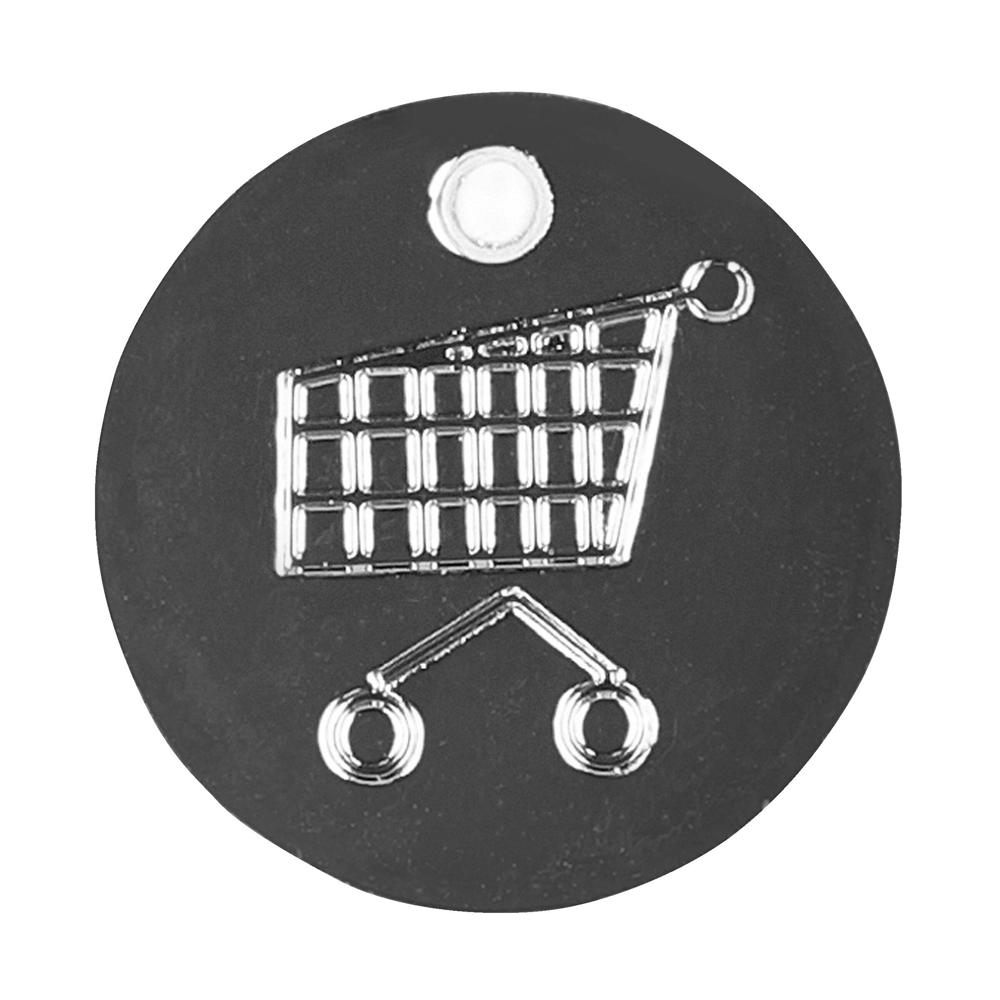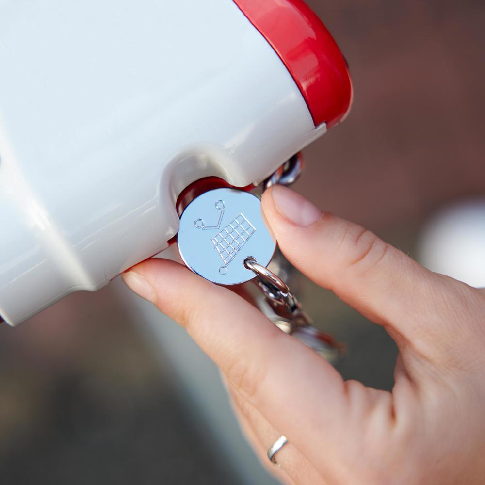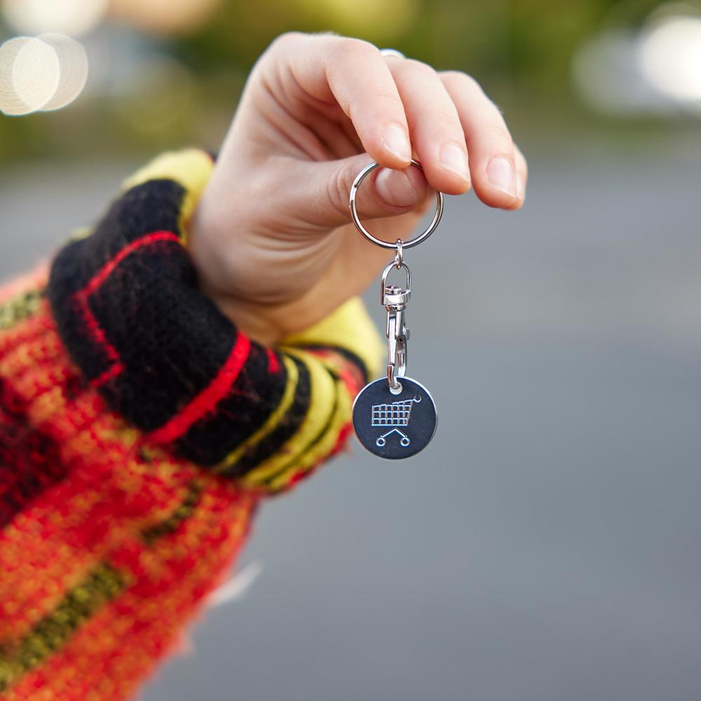 Immer am Haken. Nützlicher Einkaufswagenchip aus Metall mit Karabinerhaken und Schlüsselring. Kann mittels Lasergravur individuell gestaltet werden. Aufgrund der Materialbeschaffenheit erscheint die Gravur auf dem Chip rötlich bzw. rosa.