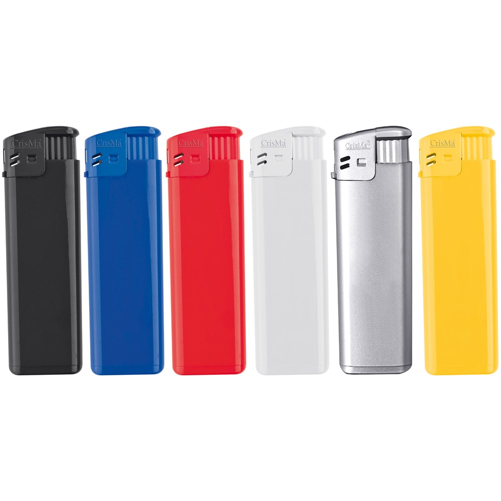 Schönes Elektronikfeuerzeug (nachfüllbar) aus Kunststoff. Selbstverständlich verfügt dieses Modell über die vorgeschriebene Kindersicherung. Ihre Werbung drucken wir auf eine Seite des Feuerzeuges.