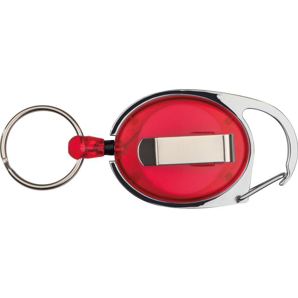 Schlüsselanhänger mit Karabinerhaken und Gürtelclip, sowie einem ausziehbaren Schlüsselring. Ihre Werbung wird auf das farbige Kunststoffteil gedruckt.