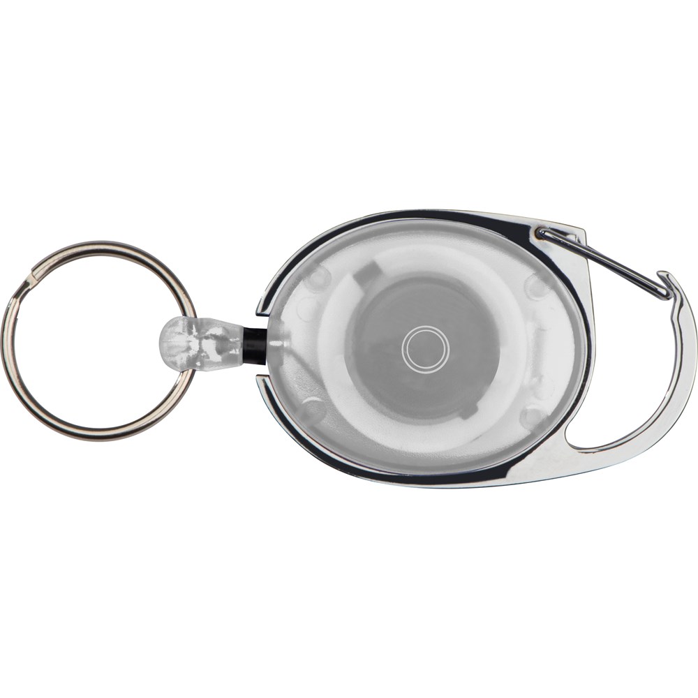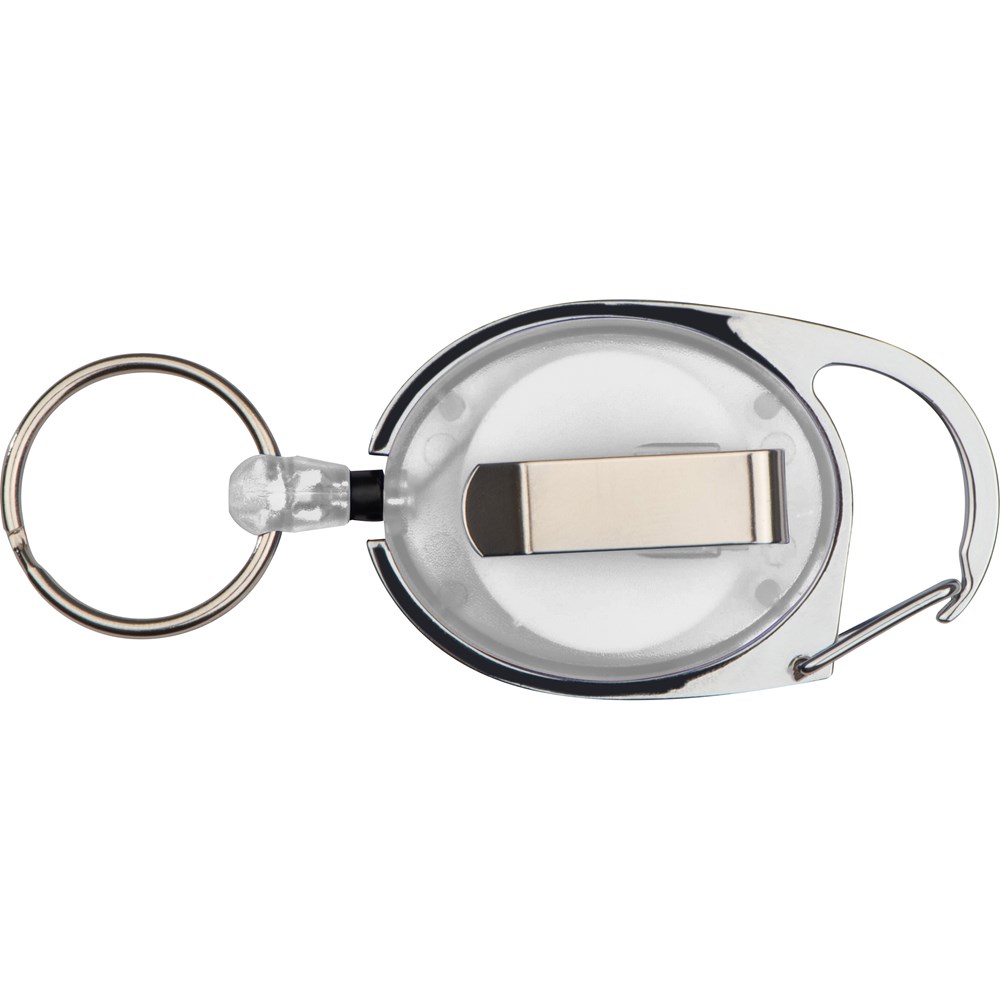Schlüsselanhänger mit Karabinerhaken und Gürtelclip, sowie einem ausziehbaren Schlüsselring. Ihre Werbung wird auf das farbige Kunststoffteil gedruckt.